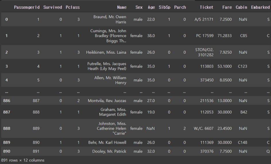 불러온 데이터를 보면 891개의 데이터(row)와 12개의 속성(columns)이 있다.